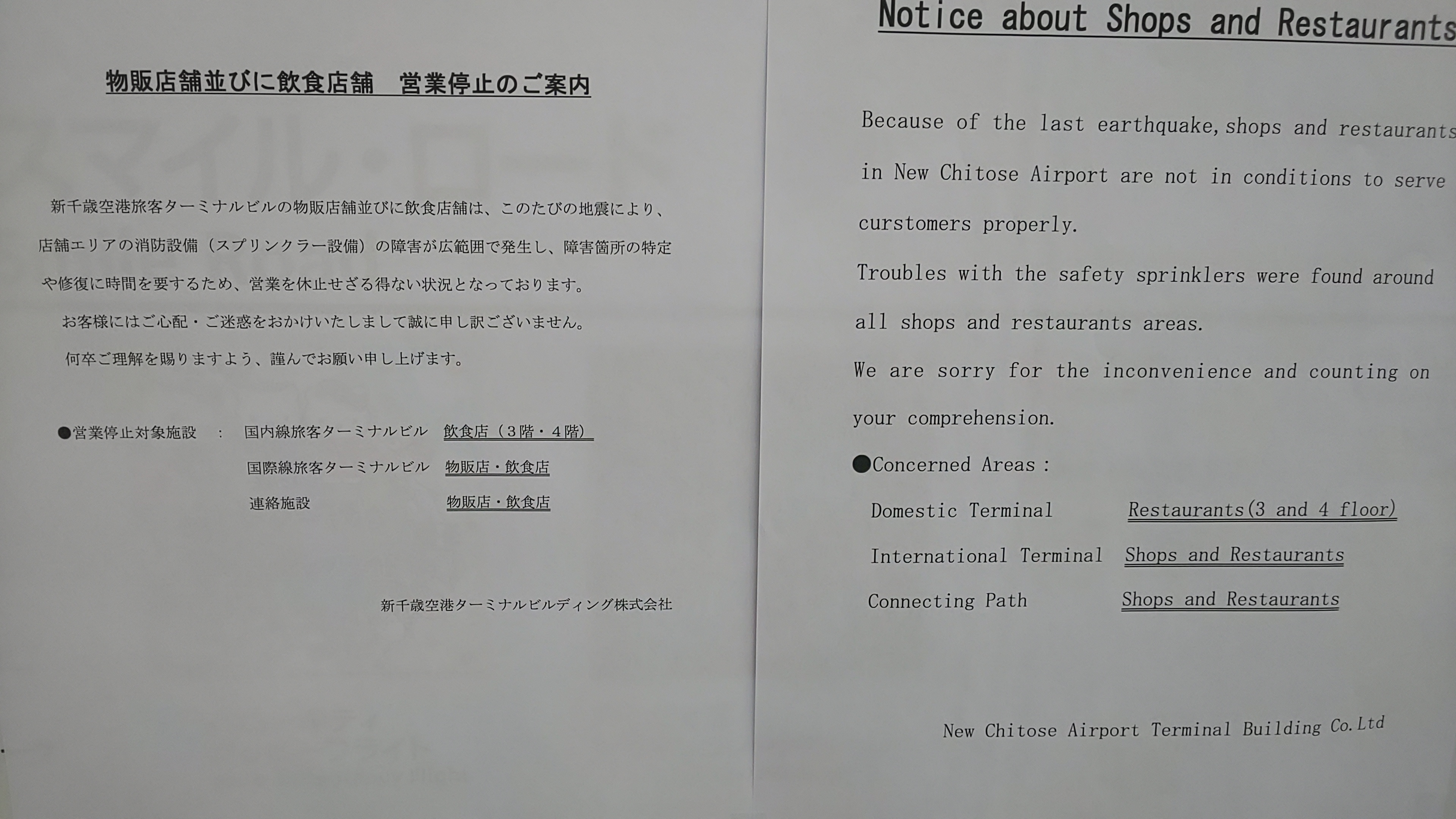 At that time, Chitose airport 3Floor and 4Floor was closed due to earth quake.